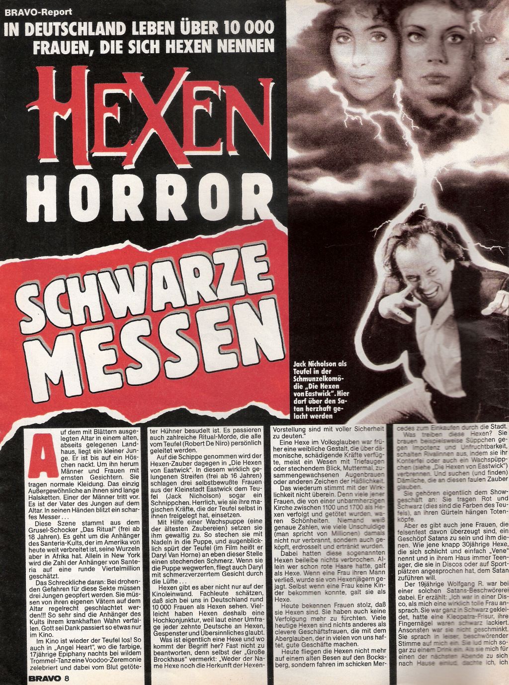 Der April steht bei Spontis ganz im Zeichen der Hexen, 1775 wurde in Deutschland die letzte Hexe verurteilt, die nur knapp ihrem tödlichen Schicksal entkommen ist. 200 Jahre später ist nicht mehr viel geblieben von dem Mythos der Hexen, spätestens seit den 60ern in der eine Hexe in einer amerikanischen Serie die Hauptrolle spielte, wurde aus ernst zu nehmenden Gefahren für Leib und Leben nur noch hübsche und hilfsbereite Wesen, deren Macht sich lediglich in Zwischenwelten der normalen Existenz abspielen und mit der Realität nicht viel gemeinsam haben. In den 80ern erscheinen einige Filme, die auch die Bravo dazu animieren der „Hexensache“ in Deutschland auf den Grund zu gehen.
