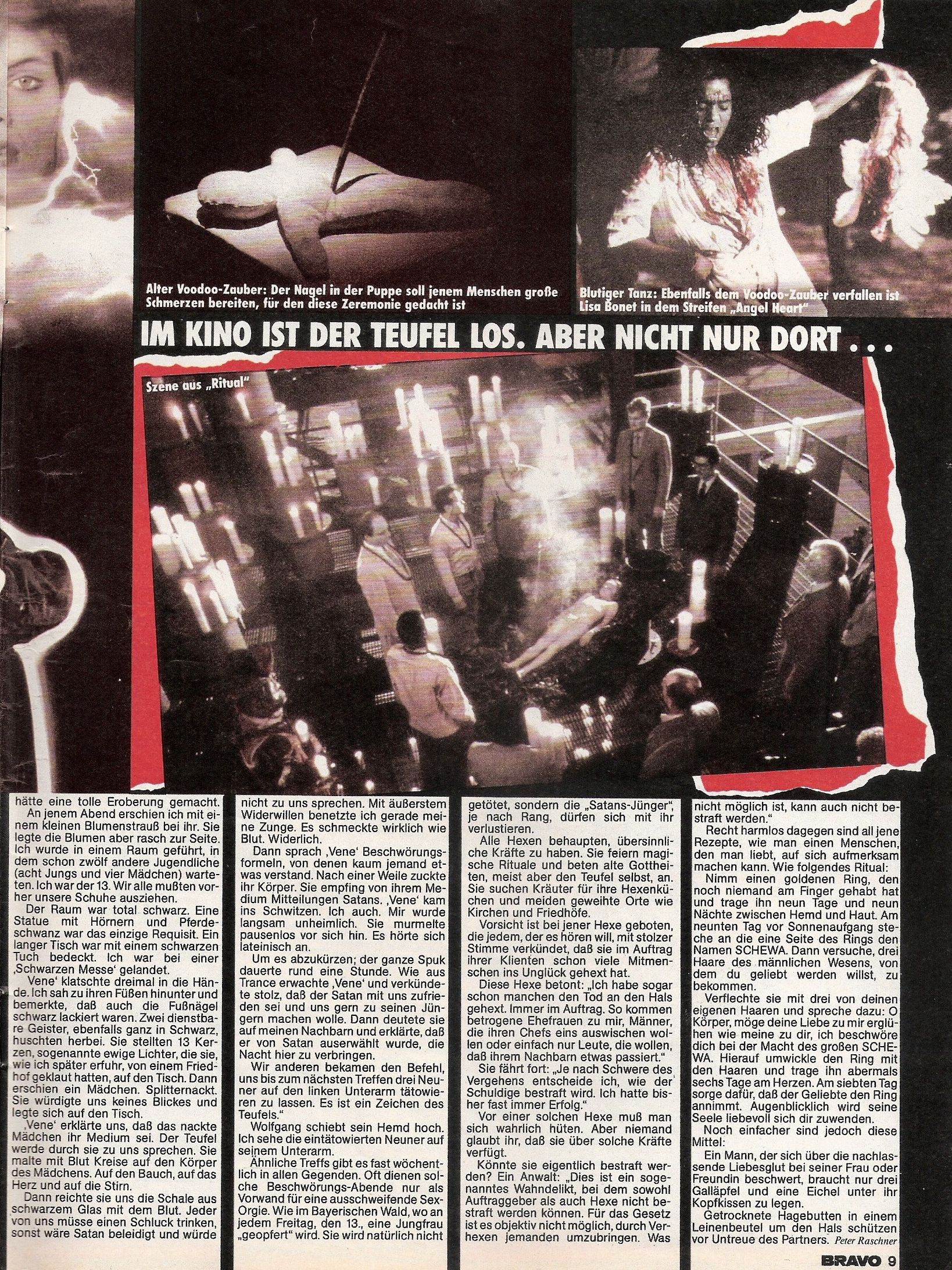 Der Report nimmt weiterhin an, das Hexen in der heutigen Zeit nur noch dem Showgeschäft angehören und nur mit Symbolen und Mythologie spielen, um dem Abergläubischen Publikum das Geld aus der Tasche zu ziehen. Im weiteren geht die Bravo eingehend auf mögliche Rituale ein und befriedigt damit die Neugier des Lesers. „Vene klatschte dreimal in die Hände. Ich sah zu ihren Füßen hinunter und bemerkte, dass auch die Fußnägel schwarz lackiert waren. Zwei dienstbare Geister, ebenfalls ganz in schwarz, huschten herbei. Sie stellten 13 Kerzen, sogenannte ewige Lichter, der sie, wie ich später erfuhr, von einem Friedhof geklaut hatten, auf den Tisch.“