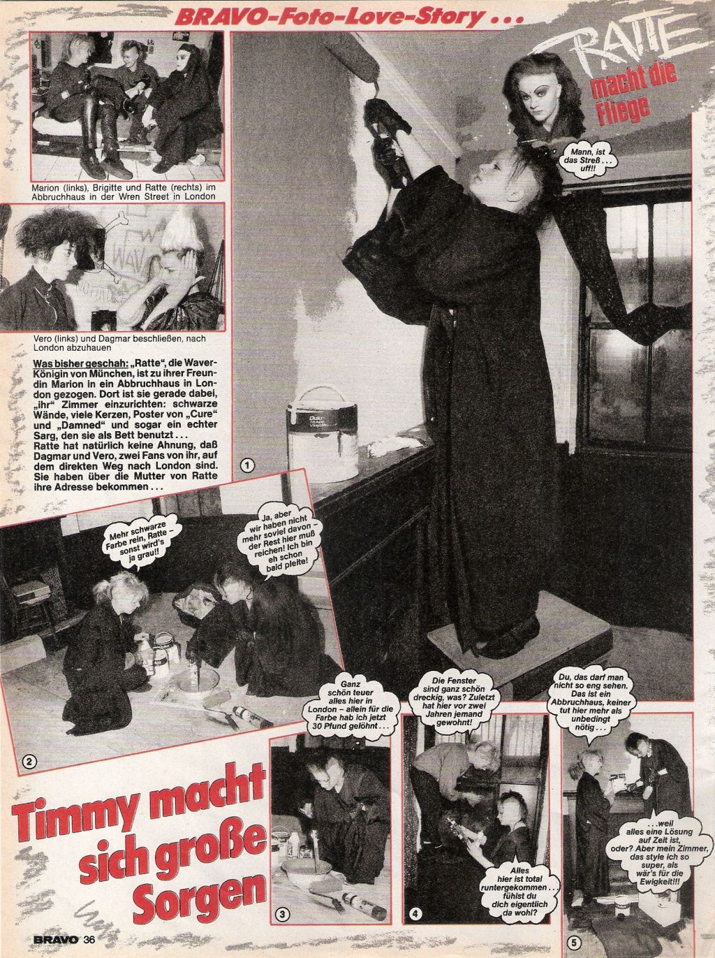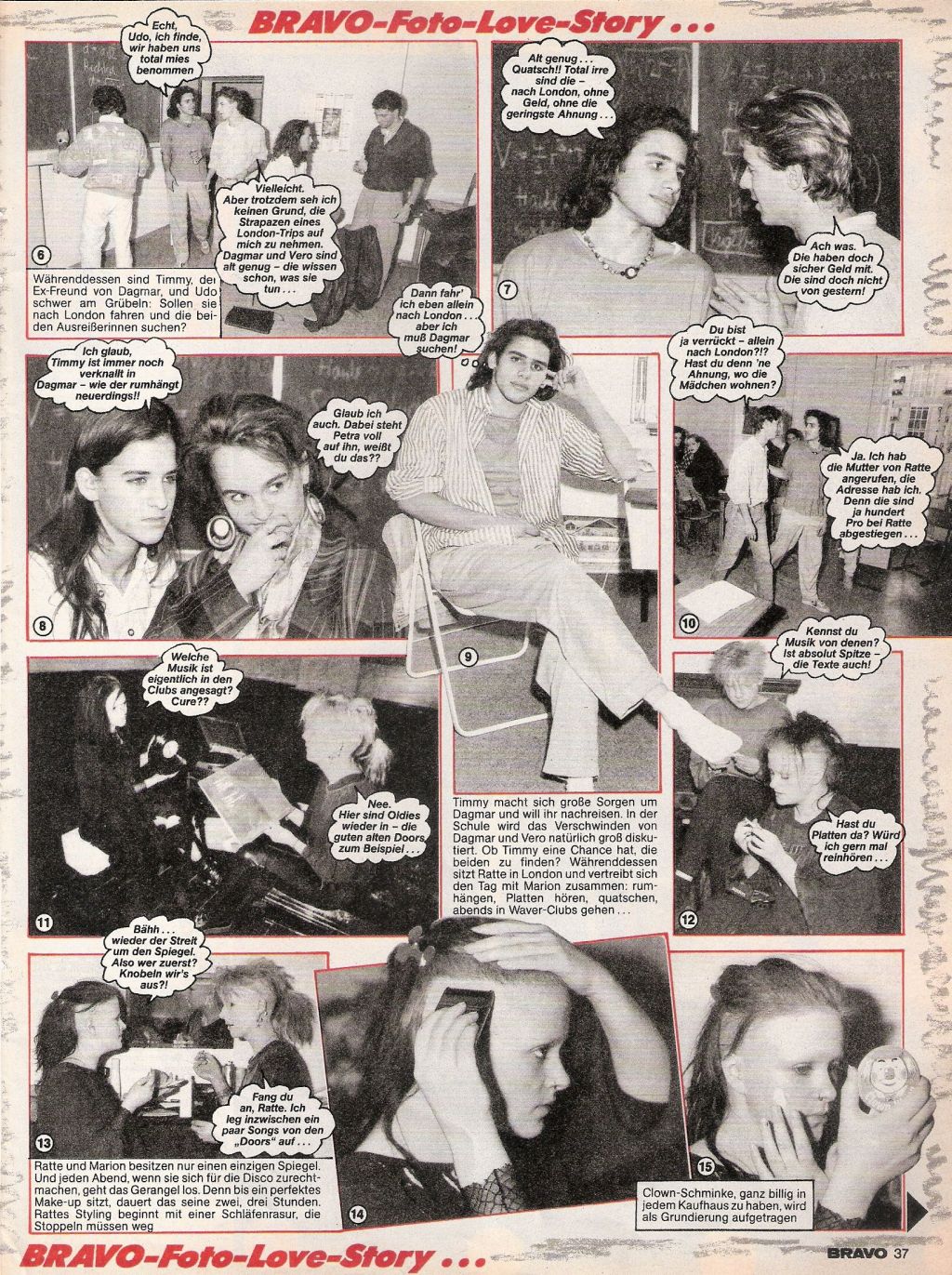 „Welche Musik ist eigentlich in den Clubs angesagt? Cure??“ – „Nee. Hier sind Oldies wieder in – die guten alten Doors zum Beispiel…“ Welcher Spät-Hippie hat sich denn da als Redakteur eingeschlichen? Die Doors sind sicherlich eine großartige Band und haben mit „Riders on the Storm“, „People are strange“ oder auch „Touch me“ zeitlose Klassiker geschaffen, das sie aber 1985 in englischen Clubs total angesagt waren, wage ich ernsthaft zu bezweifeln. Zeitzeugen mögen sich melden. Immerhin gibt es ein paar praktische Tips zum abendlichen „Diskofertigmachen“: Den Spiegel teilt man sich, der Undercut hieß „Schläfenrasur“ und Clown-Schminke aus dem Kaufhaus bildet die Grundierung „Dann wird das Gesicht mit weißem Puder bestäubt…die rasierten Augenbrauen werden hauchdünn nachgezogen, dunkelgraue Lidschatten gemalt, die Lippen knallrot ausgepinselt…„. Klingt gut! Und der arme Timmy? Der macht sich Sorgen um Dagmar, die auf dem Weg ist, Ratte zu besuchen.