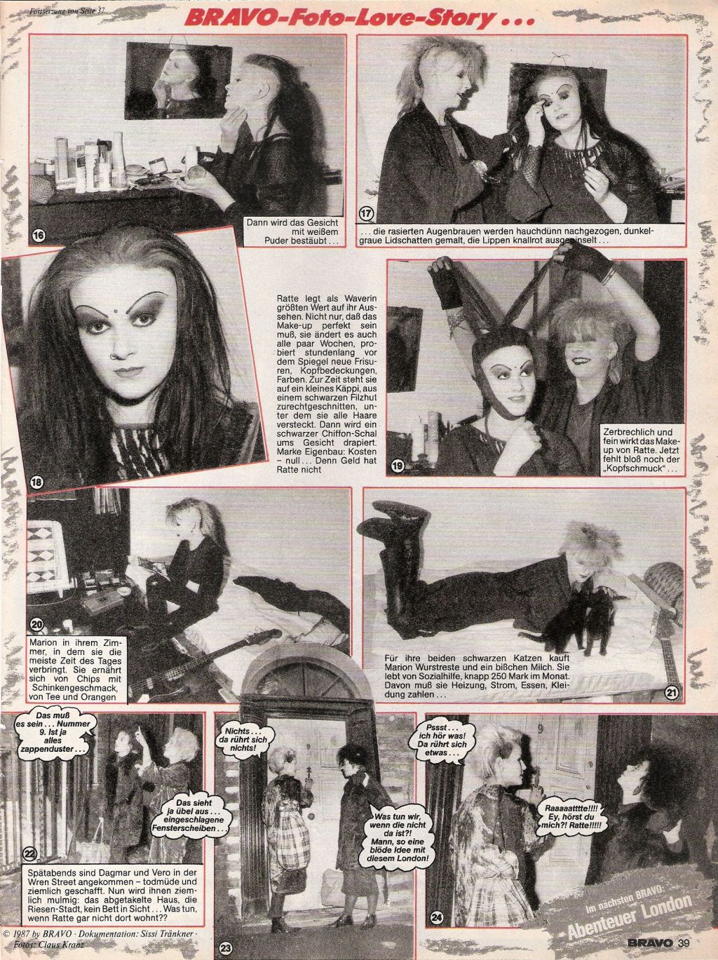 Diese Carla ist aber auch ein Münchener Wave- und Gothicstrudel und hat gleich reihenweise jungen Menschen in das düstere Verderben gezogen. Nicht nur das viele den Artikel über sie verschlungen haben und ihrem Beispiel folgten, jetzt macht sich auch noch Karriere in einem der renommiertesten Jugend-Foto-Romanen der 80er. Wir wollen in der mehrteiligen Reihe beobachten, was aus Carla und ihren Freundinnen wird und wie die BRAVO die moralische Kurve kratzt.