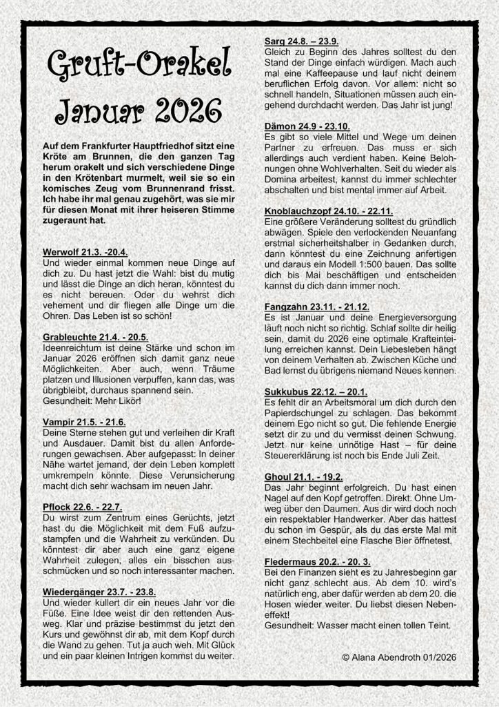 Wenn du in der Hölle wohnst, werden Dinge wie Angst, Verderben, Qual und Finsternis die Wohlfühlmomente, in denen du badest, um dir einen schönen Abend zu machen. Wenn allerdings das vermeintlich „Böse“ die Normalität ist, was braucht es dann, um beispielsweise den Mitgliedern des Orakels einen kalten Schauer über den Rücken zu jagen? Beim Sukkubus ist es das Finanzamt. Von fehlender Arbeitsmoral, wie Alana Abendroth in ihrem Orakel behauptet, kann gar nicht die Rede sein! Aber diese Formularodyssee in kaum verständlichem Beamten-Deutsch ist das Grauen aus einer anderen Dimension. Allein schon es „Steuererklärung“ zu nennen, grenzt an Sarkasmus. Den Start in das neue Jahr allerdings auch mit Gedanken an eben diese zu verschwenden, ist – mit Verlaub gesagt – extrem leichtsinnig. Euch allen ein frohes neues Jahr 2026!