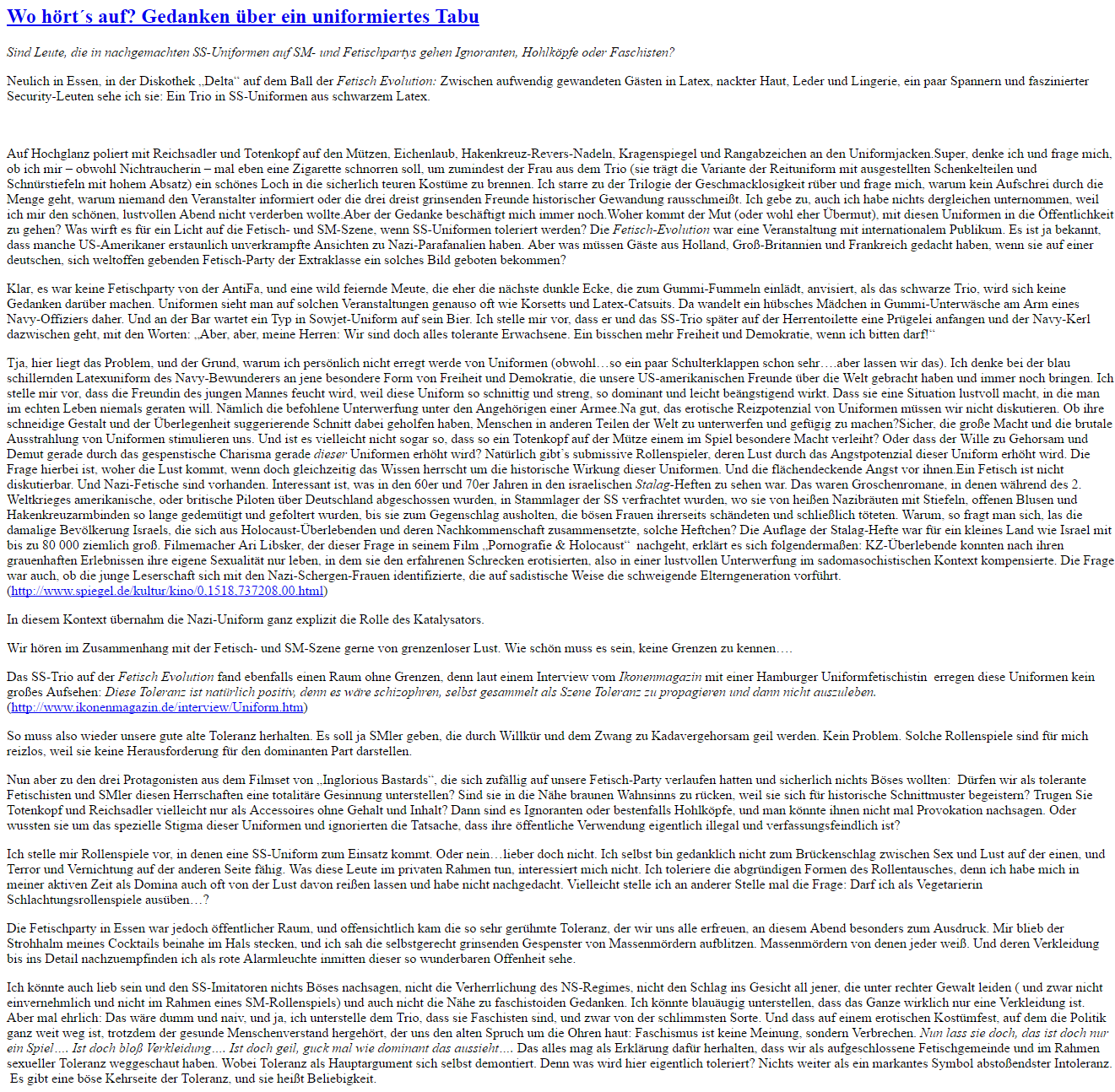 Manche Uniformen sehen denen des dritten Reichs sogar zum Verwechseln ähnlich, oder sind tatsächlich Originale mit nur notdürftig abgedeckten Details. An den Ständen von X-tra-X warten unzählige uniform-ähnliche Bekleidungsstücke auf kaufwillige Kunden und Military-Shops gehören mittlerweile zum festen Bestandteil des kommerziellen Szeneangebots. Zahlreiche Bands und Musiker nutzen Uniformen und militärisches Auftreten, um sich und ihre Musik auf der Bühne zu präsentieren. Man wird das Gefühl nicht los, dass man vor der Bühne dieses Vorbild aufgreift und zum modischen Stil degradiert oder Soldaten-Kleidung als Kostüm benutzt, ohne sich mit den Hintergründen zu beschäftigen. [zum Artikel…] - Schwarz-Braun sind auch wir? (Ein Artikel von Guldhan vom 4. Juni 2011 )