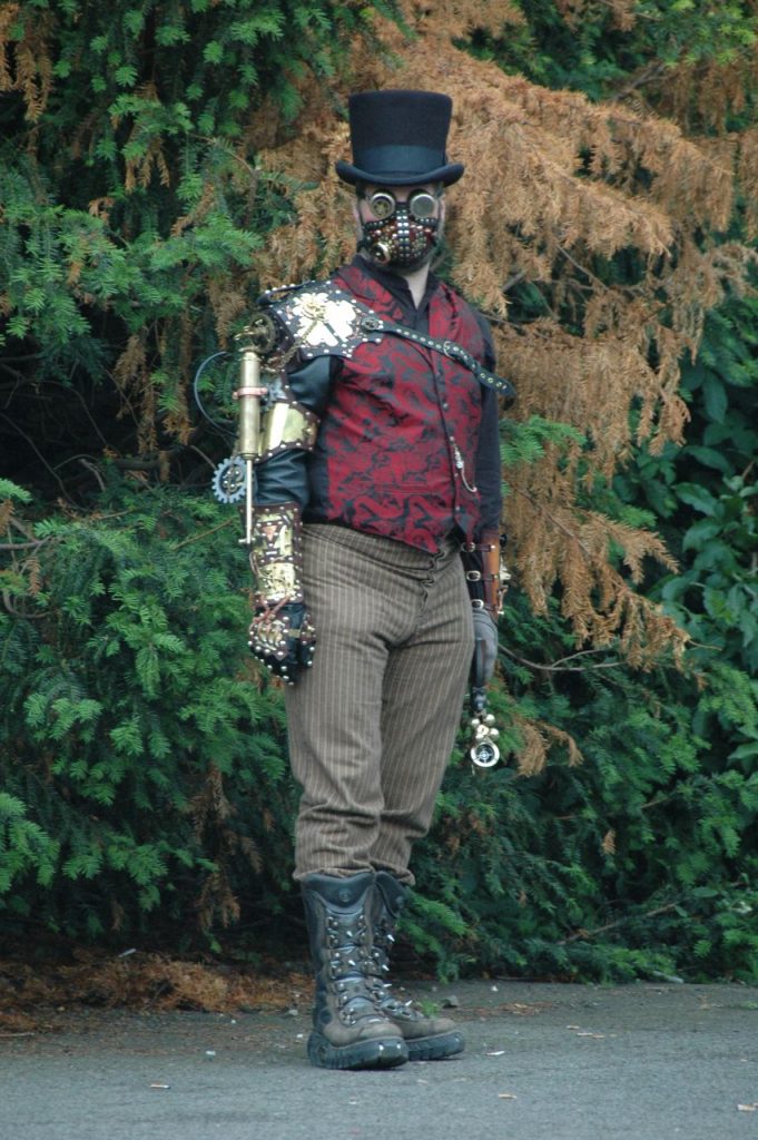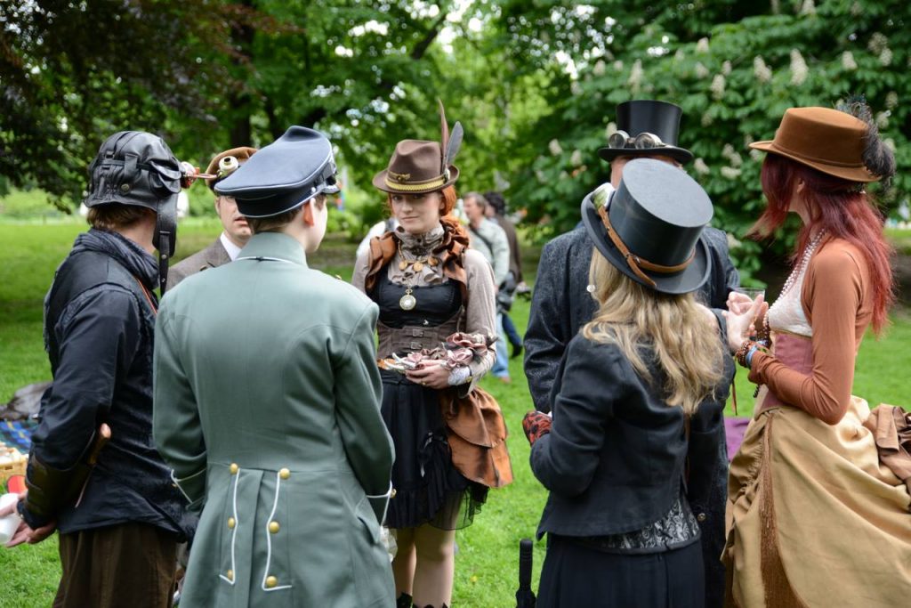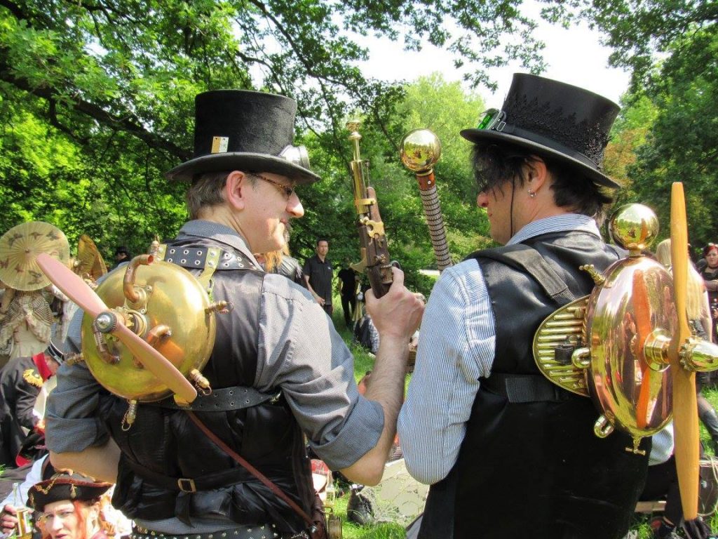 Ich mag den Steampunk-Stil eigentlich recht gern, wenn ich mir die Gestalten auf dem Foto angucke kann ich ein süffisantes Grinsen nicht unterdrücken. Sieht für mich nach Fasching auf dem Schrottplatz aus. „Der mächtige Dampfstrahl aus meinem Rektum zerstört mit einer Kupferdurchdringung von 10 dein Dampfbügeleisen…“.